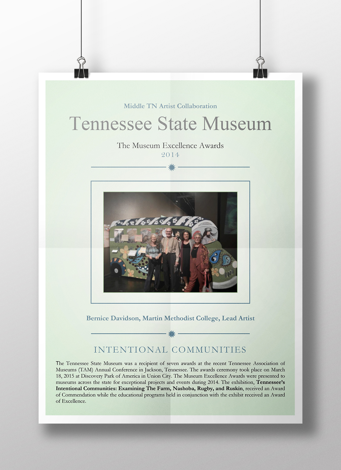 Presented an exhibit of Tennessee Intentional Communities throughout history. The installation, executed by collaborating artists, including scenic design by Leon Fuller, won a Museum Award for Excellence.